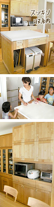アイランドカウンター中心のキッチンにしたため、 子供たちと一緒に趣味のパンつくりをしたり、 お友達を呼んでパーティーをしたり、とても使い やすいです。また、アイランドカウンターには カトラリー入れを作ったり、いつも収納に困る おぼん入れなども作ってもらい、片付けも楽に なりました。